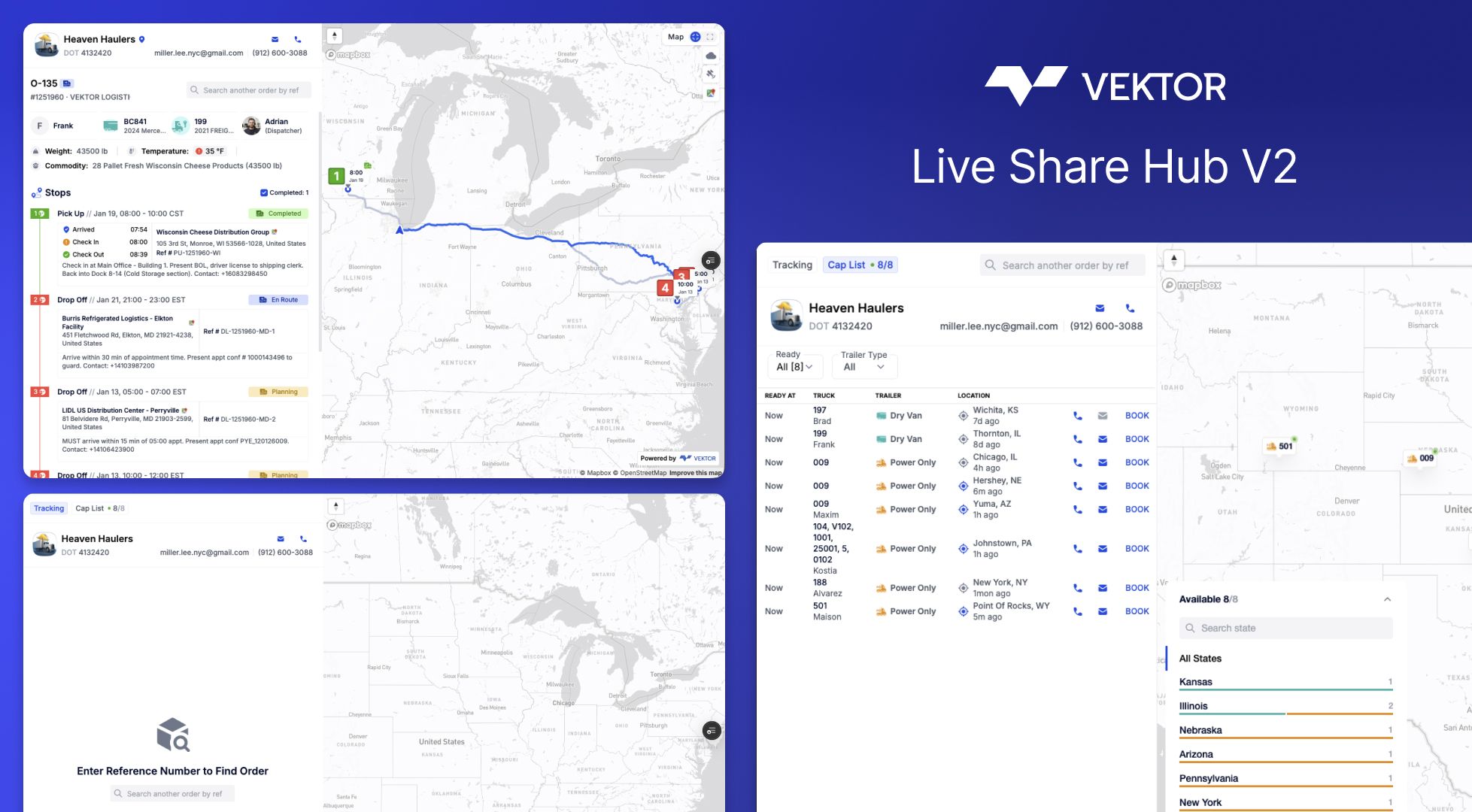 Shared source of truth – Your customers see the same location, status, and ETA data you see in Vektor—fewer check calls and no surprises.