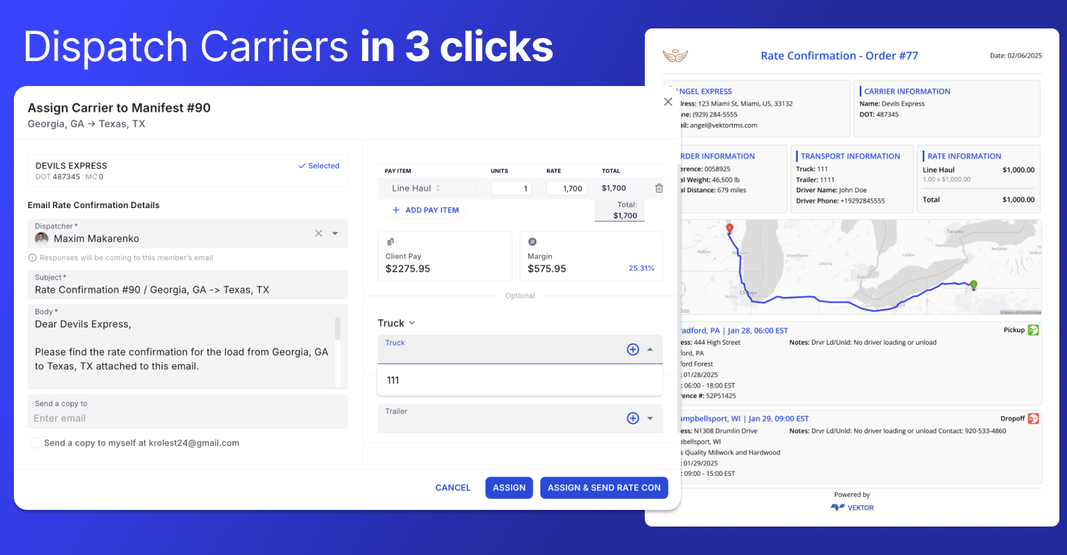 Assign carriers and share rate confirmations in just 3 clicks—no driver details required! Select a carrier, set the rate, and hit send.
