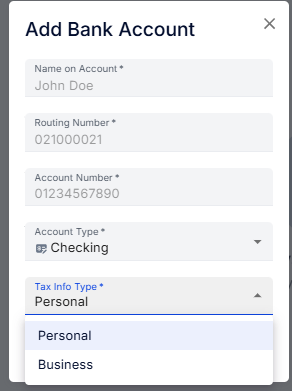 Now, when creating a bank account, you can select the Account Type and Tax Info Type. This enhancement provides greater flexibility and precision in managing payouts.