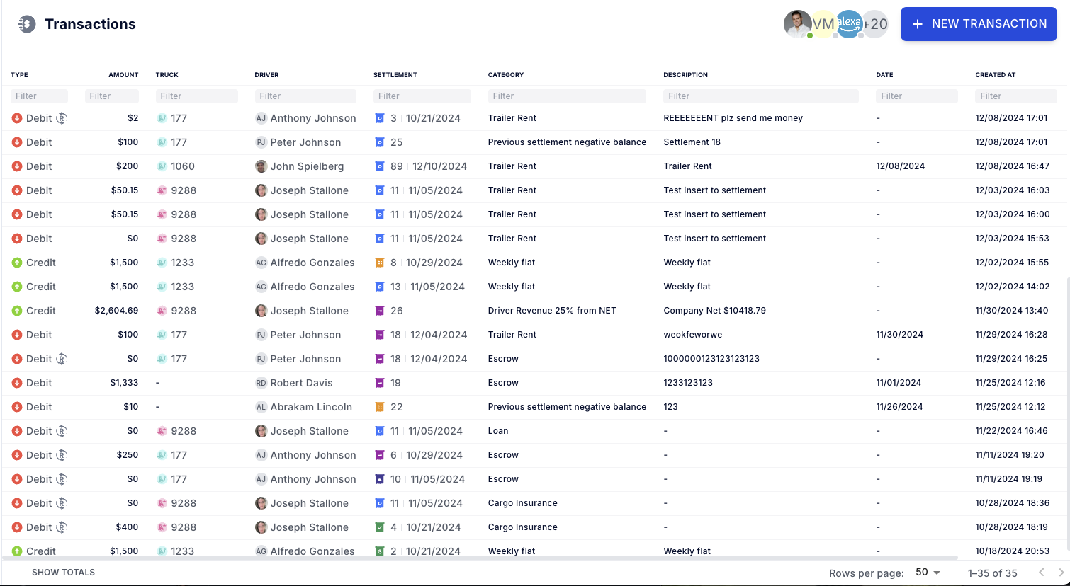 Easily view and manage all driver and vendor-related transactions with our new accounting component, Transactions. This feature provides high-level visibility and streamlines financial oversight.