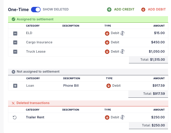 Gain enhanced control over transactions by unassigning one-time transactions and assigning them to future settlements from the "Not Assigned" pool, similar to Fuel and Tolls. Additionally, you can now recover deleted transactions, ensuring greater flexibility and accuracy in financial management.