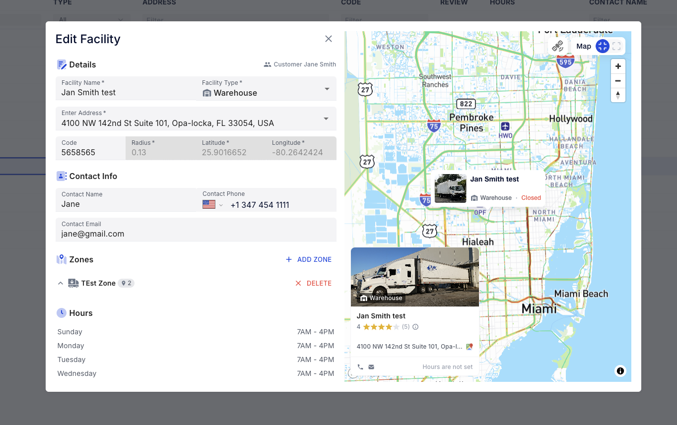 We are excited to announce the launch of our new Customer Facilities feature, designed to enhance the management of dedicated freight operations. This feature allows you to efficiently map all facilities associated with specific customers, including details such as hours of operation, precise locations, specific coordinates and even Google Location reviews and photos! When creating a new order, the system will automatically suggest relevant facilities, streamlining your workflow and improving operational efficiency.