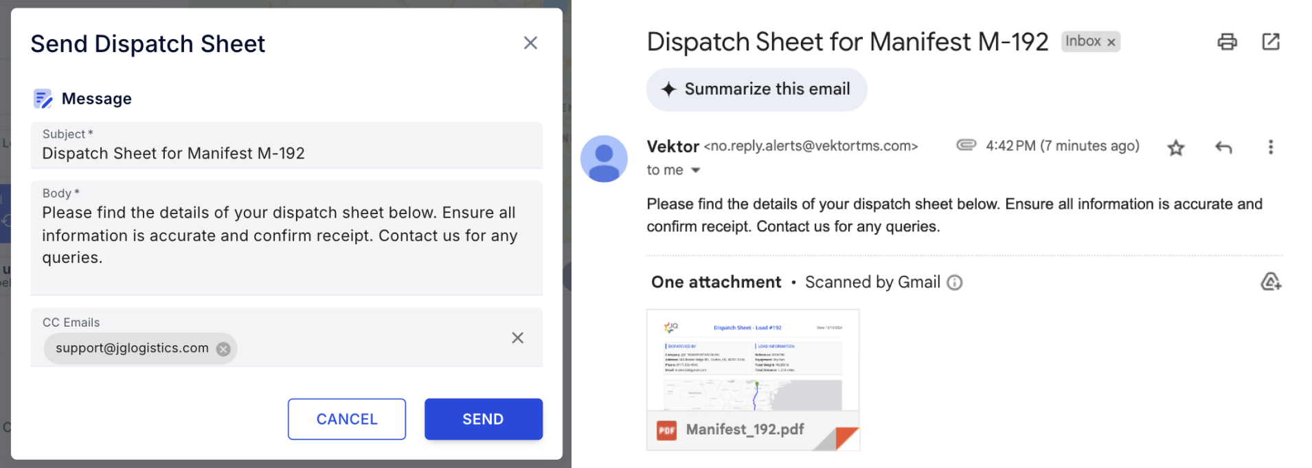 Easily email a PDF Dispatch Sheet directly to the assigned driver from the manifest screen. This feature complements the information available in the app, ensuring drivers have all necessary details at their fingertips for improved communication and efficiency.