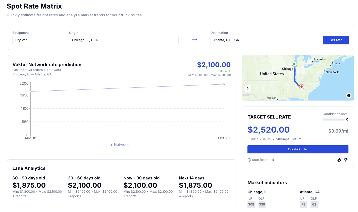 Leverage Vektor’s Network Anonymized Data to estimate spot rate costs quickly and accurately. This tool empowers our carrier network to gauge average freight prices using our proprietary or licensed data, giving your dispatch team a competitive edge when quoting freight to brokers or customers—all at no cost!